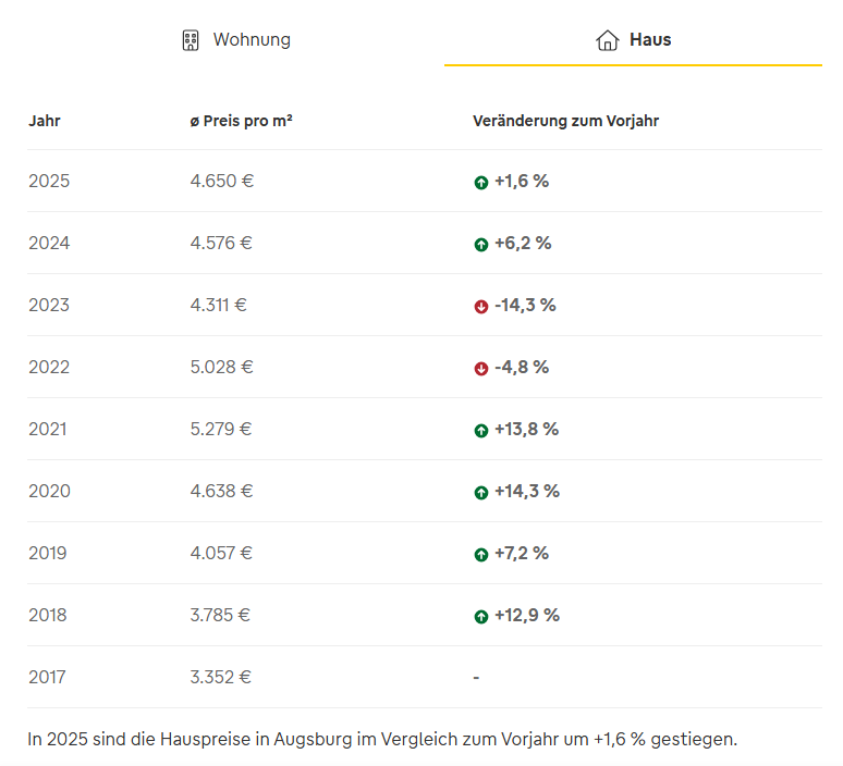 Die Preisfindung ist das Herzstück jedes Immobilienverkaufs. In Augsburg liegen die durchschnittlichen Hauspreise 2025 bei etwa 4.650€ pro Quadratmeter, in guten Lagen sogar über 5.500 € pro Quadratmeter.